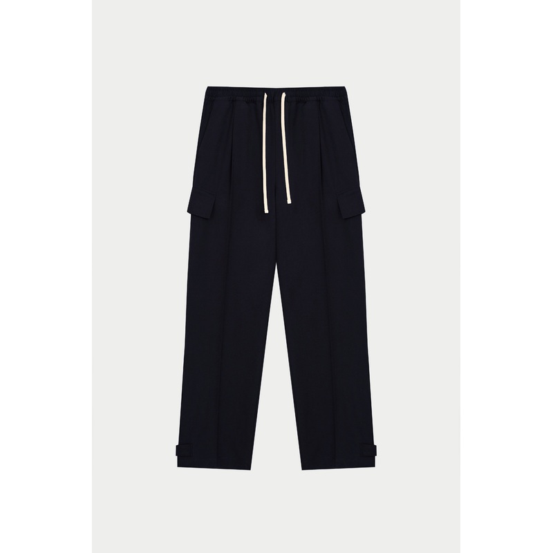 Colour: NavyDetails:- Relaxed wide leg fit- Self fabric waistband with herringbone draw cord fastening- Side seam pockets- Pleating detail down front legs- Functional welt pocks to back- Popper fastening at hem- Functional side pockets with exposed pocket