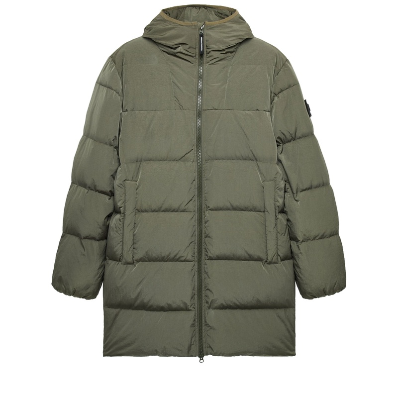 Longline down jacket made from lightweight high density woven 100% Nylon parachute style fabric with misted lightly reflective surface. Treated with an additional DWR (Durable Water Repellent) coating.70/30 goose down fill ratio, with ultra-light insulatin