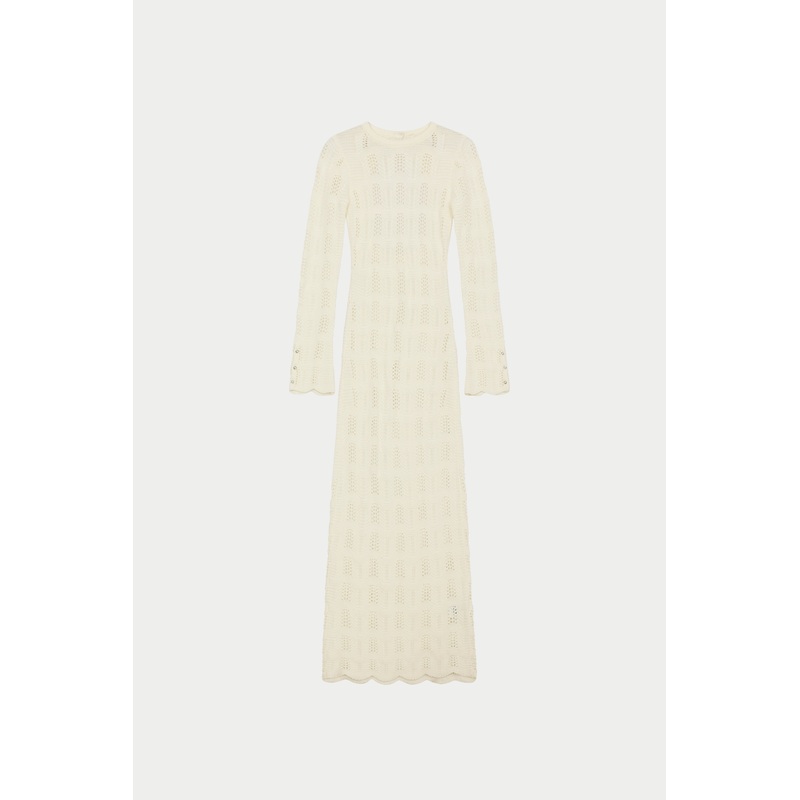 Colour: Off WhiteDetails:- Long sleeved scallop edge knitted maxi dress- Flute shaped flared sleeve with pearlised button detailing- Crochet knit fabric- Ribbed neckline- Rounded cut out back with pearlised button back collar fastening- Scallop detail hemM