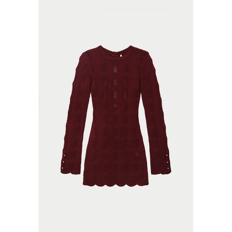 Colour: BurgundyDetails:- Long sleeved scallop edge knitted mini dress- Elongated flared sleeve with pearlised button detailing- Crochet knitted fabric- Ribbed neckline- Cut out back with pearlised button back collar fastening- Scallop detail hemModel wear