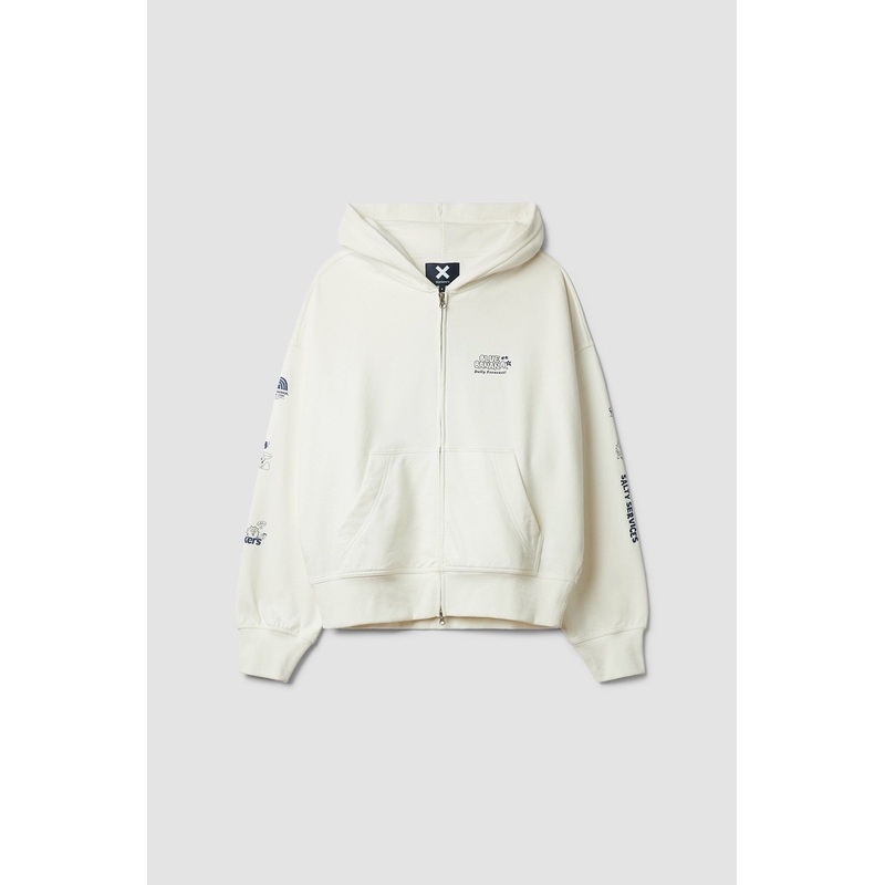 Hoodie con cremallera. Print delantero y en ambas mangas. Confeccionada con algodn 100% orgnico. Sin cardar para un resultado ms veraniego. Corte boxy fit.