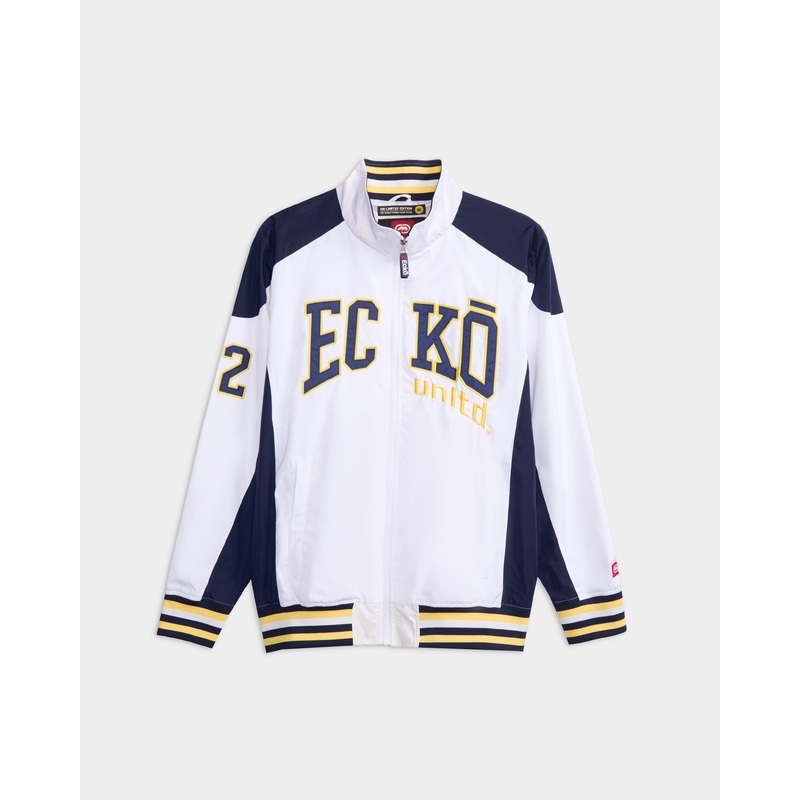 Level up your streetwear game with the . “Track is Back” Jacket. Featuring a sharp white and blue color block design, this lightweight jacket brings serious attitude to any outfit. The oversized varsity-style ECK logo across the chest and the 92 patch on the sleeve throw it back to the golden era of hip-hop and hustle.